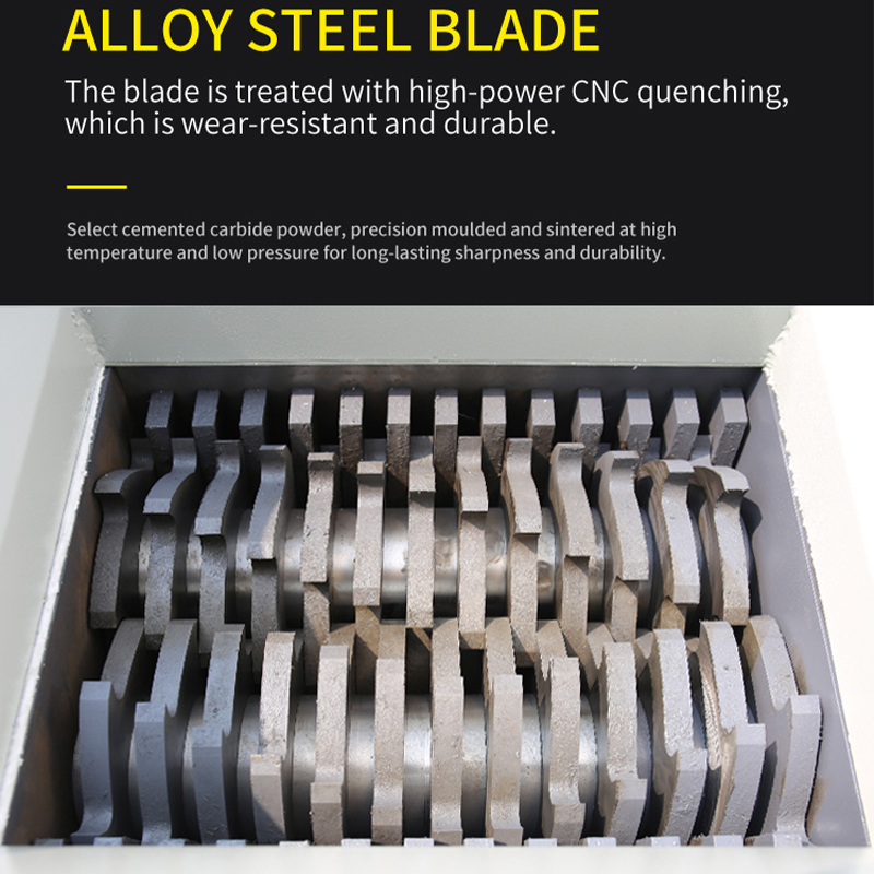 ● Мощная конструкция двойного вала: двойные карбидные стволы с ножами вращаются в обратном направлении, чтобы достичь высокоэффективной силы сдвига, легко измельчать упрямых материалов, таких как древесина, пластик, тонкий металл и так далее.